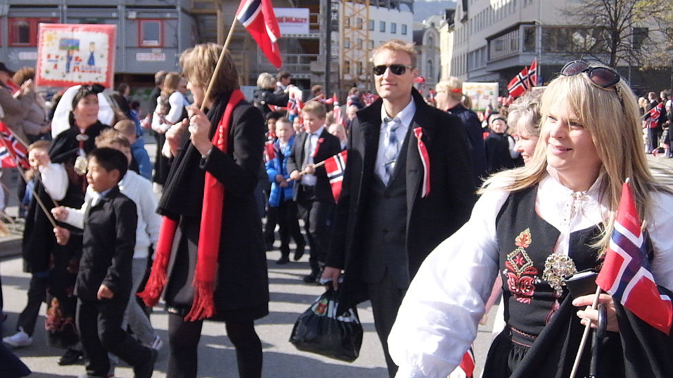 与其说是国庆日,倒更像是全民的狂欢日。大家身着传统的挪威民族服装Bunad,或者西服正装胸前挂彩带装饰,手举国旗,庆祝着这重要的日子。Bunad有很多种类和颜色,代表着不同的地区。还有佩戴的银饰也十分精致。