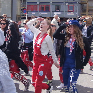 另外一个非常抢眼的队伍便是即将毕业的高中生Russ。如果你不知道挪威的Russ,不妨去看下电视剧Skam了解一下。他们身着不同颜色的背带裤,在队伍中欢歌雀跃着。他们不同颜色的衣服,代表了不同领域的学科。从四月底开始就可以在马路上陆续看到穿着Russ制服的孩子们了。他们有的租上大巴开始各种Party。但也因为过度饮酒,夜间扰民,旷课等原因,今年